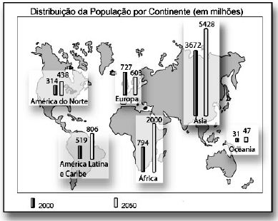 A história recente da humanidade nos mostra um dinamismo intenso, difuso e desigual da população mundial. O mapa a seguir nos mostra a distribuição da população por continentes em 2000 e a projeção para 2050.