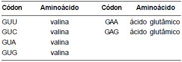 Examinando a tabela do código genético a seguir, é possível identificar as alterações no RNA que formam o códon da valina na hemoglobina da anemia falciforme.