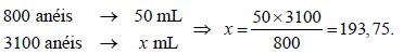 Por curiosidade, Vera pôs 800 “anéis” de latinhas de refrigerante (aquelas alavancas usadas para abrir as latas) numa vasilha com água, e observou que o volume de líquido deslocado pelos anéis foi de 50 mL. Depois, pegou uma garrafa vazia, com capacidade de 2,5 litros, e encheu-a até a boca com 3.100 desses anéis.