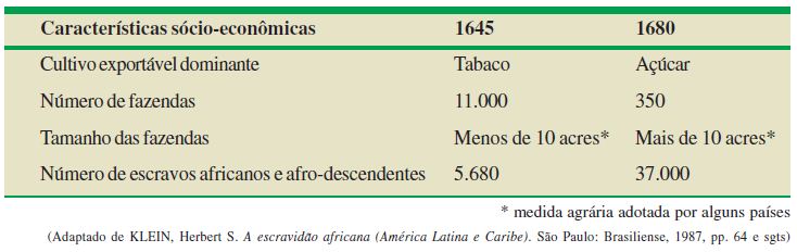 a) Relacionando as variáveis presentes na tabela, explique como o exemplo de Barbados ilustra as transformações fundiárias e sociais próprias da maior inserção das regiões escravistas americanas no mercado internacional na época colonial.