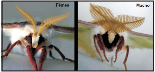 A reprodução de muitas espécies de mariposas é facilitada por substâncias voláteis lançadas no ar chamadas feromônios. Tais substâncias são produzidas por fêmeas e capazes de atrair machos a milhares de metros de distância. Cada feromônio atrai machos da espécie da fêmea que os produziu. A eficiência dos feromônios está relacionada a grandes diferenças morfológicas entre machos e fêmeas (dimorfismo sexual), como mostram as figuras abaixo. Armadilhas contendo feromônios são utilizadas para eliminar mariposas consideradas pragas das lavouras.