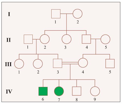 O heredograma a seguir mostra a herança de uma doença autossômica recessiva hereditária. Essa doença é muito rara na população à qual pertence esta família. Os indivíduos que entraram na família pelo casamento (II 1 e II 5) são normais e homozigotos. A linha horizontal dupla representa casamentos entre primos. Os indivíduos 6 e 7 marcados da geração IV apresentam a doença, os demais são fenotipicamente normais.