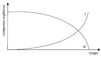 Em um tubo de ensaio foram adicionados uma secreção do tubo digestório humano e um composto orgânico. A temperatura foi mantida à 40 oC e em pH igual a 7. Após certo tempo, o composto orgânico (II) foi hidrolisado e formou-se um outro composto (I), como mostra o gráfico: