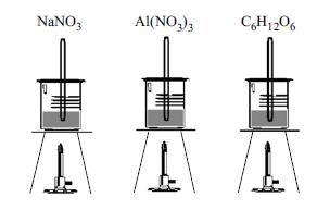 Três soluções aquosas de nitrato de sódio, nitrato de alumínio e glicose, com concentrações 0,5 mol/L, foram aquecidas em três béqueres, sob as mesmas condições ambientes, até a ebulição. As temperaturas das três soluções foram monitoradas com três termômetros devidamente calibrados.