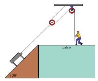 Na montagem da estrutura para um show musical, será necessário transportar um piano de cauda de 500 kg para o palco. Para facilitar esse trabalho, foi montado um plano inclinado e um sistema de roldanas, como representado na figura.