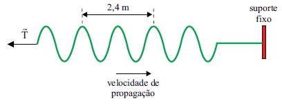 Para fazer uma demonstração em sua aula de ondulatória, um professor prendeu a extremidade de uma corda elástica de densidade linear de massa igual a 0,2 kg/m a um suporte fixo. Em seguida, ele segurou a outra extremidade da corda e manteve-a inicialmente esticada e em repouso, na horizontal, exercendo sobre ela uma força de tração de módulo T. A partir de um dado instante, ele oscilou verticalmente a mão que segurava a corda, de modo que em 2 s o perfil da corda assumiu a forma representada na figura.