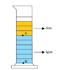 Sabe-se que, na escala da proveta, as linhas horizontais estão igualmente distanciadas e que as densidades da água e do óleo valem, respectivamente, 1 g/cm3 e 0,8 g/cm3. Sendo PA a pressão hidrostática que o óleo exerce no ponto A e PB a pressão hidrostática que o óleo e a água, juntos, exercem no ponto B, é correto afirmar que a razão PB é igual a