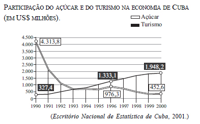 Observe o gráfico sobre a participação do açúcar e do turismo na economia cubana e assinale a alternativa que justifica as causas da evolução dos dois produtos representados.