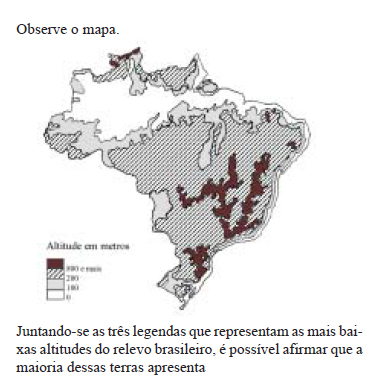 Juntando-se as três legendas que representam as mais baixas altitudes do relevo brasileiro, é possível afirmar que a maioria dessas terras apresenta