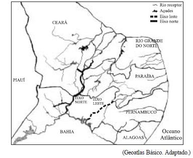 O mapa representa área do território brasileiro objeto de um grande e polêmico projeto que, desde o período imperial, visa a solucionar o problema da falta de água na região.