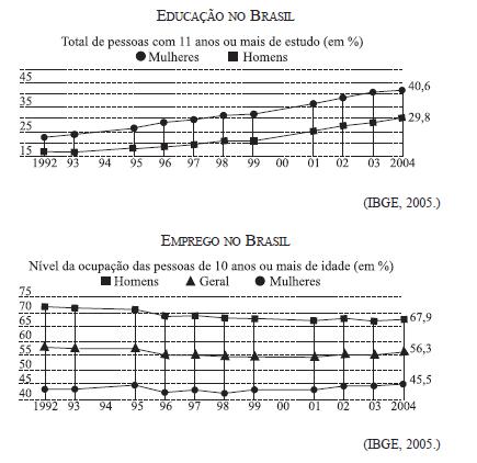 O conceito de analfabetismo sofreu mudanças desde a Antiguidade até os dias atuais. No Brasil, os valores da taxa de analfabetismo decresceram de 54,5% em 1940 para 13,3% em 1999. Os resultados da Pesquisa Nacional por Amostra de Domicílios (PNAD) permitem comparar a situação de homens e mulheres no aspecto educacional e no nível de ocupação, no período 1992 a 2004. Observe os gráficos.