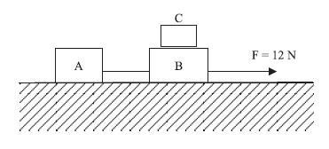 Dois corpos, A e B, atados por um cabo, com massas mA = 1 kg e mB = 2,5 kg, respectivamente, deslizam sem atrito no solo horizontal sob ação de uma força, também horizontal, de 12 N aplicada em B. Sobre este corpo, há um terceiro corpo, C, com massa mC = 0,5 kg, que se desloca com B, sem deslizar sobre ele. A figura ilustra a situação descrita.