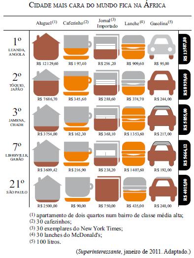 A revista Superinteressante trouxe uma reportagem sobre o custo de vida em diferentes cidades do mundo. A tabela mostra o ranking de cinco das 214 cidades pesquisadas pela “Mercer LLC”, empresa americana, em 2010.