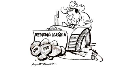 Analise a charge, publicada originalmente em 17.05.1963, e identifique como ela representa as dificuldades enfrentadas pelo governo João Goulart em seu projeto de reformas sociais.