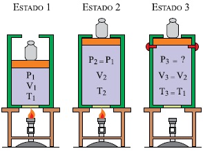 No estado 1, o gás está submetido à pressão P1 = 1,2 × 105 Pa e ocupa um volume V1 = 0,008 m3 à temperatura T1. Acende-se uma chama de potência constante sob o cilindro, de maneira que ao receber 500 J de calor o gás sofre uma expansão lenta e isobárica até o estado 2, quando o êmbolo atinge o topo do cilindro e é impedido de continuar a se mover. Nesse estado, o gás passa a ocupar um volume V2 = 0,012 m3 à temperatura T2. Nesse momento, o êmbolo é travado de maneira que não possa mais descer e a chama é apagada. O gás é, então, resfriado até o estado 3, quando a temperatura volta ao valor inicial T1 e o gás fica submetido a uma nova pressão P3. Considerando que o cilindro tenha capacidade térmica desprezível, calcule a variação de energia interna sofrida pelo gás quando ele é levado do estado 1 ao estado 2 e o valor da pressão final P3.