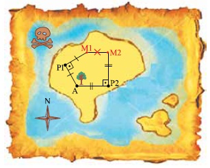 Ao aportar na ilha, Jack, examinando o mapa, descobriu que P1 e P2 se referem a duas pedras distantes 10 m em linha reta uma da outra, que o ponto A se refere a uma árvore já não mais existente no local e que