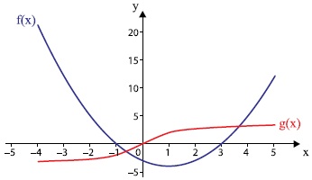 Os gráficos de duas funções f(x) e g(x), definidas de R em R, estão representados no mesmo plano cartesiano.
