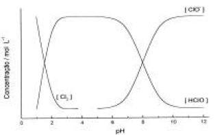 No tratamento da água, a fase seguinte à de separação é sua desinfecção. Um agente desinfetante muito usado é o cloro gasoso que é adicionado diretamente à água. Os equilíbrios químicos seguintes estão envolvidos na dissolução desse gás: