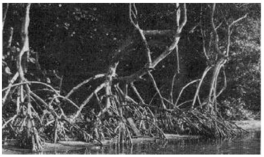 Devido à falta de oxigênio, à instabilidade do substrato e à ação das correntes, estas espécies apresentam raízes escoras, ou pneumatóforos, que ampliam a base de suporte e facilitam a troca gasosa com o ambiente. O emaranhado de raízes reduz a velocidade das correntes, acarretando um depósito extenso de argila e lodo.