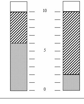 As “margarinas”, muito usadas como substitutos da manteiga, contêm gorduras vegetais hidrogenadas. A diferença fundamental entre uma margarina “light” e outra “normal” está no conteúdo de gordura e de água. Colocou -se em um tubo de ensaio uma certa quantidade de margarina “normal” e, num outro tubo de ensaio, idêntico ao primeiro, colocou-se a mesma quantidade de margarina “light”. Aqueceu -se em banho-maria os dois tubos contendo as margarinas até que aparecessem duas fases, como esquematizado na figura.