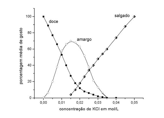 O gráfico abaixo mostra a variação do sabor de uma solução aquosa de cloreto de potássio em função da concentração deste sal. Ao se preparar uma sopa (1,5 litros), foi colocada a quantidade mínima de KCl necessária para se obter sabor “salgado”, sem as componentes “amargo”e “doce”.