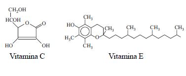 As vitaminas C e E, cujas formas estruturais são apresentadas a seguir, são consideradas antioxidantes, pois impedem que outras substâncias sofram destruição oxidativa, oxidando-se em seu lugar. Por isso, são muito utilizadas na preservação de alimentos.
