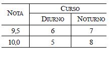 Com base na tabela, a probabilidade de que o aluno sorteado tenha tirado nota 10,0 e seja do curso noturno é: