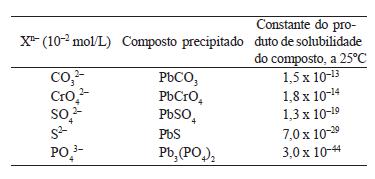 Compostos de chumbo podem provocar danos neurológicos gravíssimos em homens e animais. Por essa razão, é necessário um controle rígido sobre os teores de chumbo liberado para o ambiente. Um dos meios de se reduzir a concentração do íon Pb2+ em solução aquosa consiste em precipitá-lo, pela formação de compostos poucos solúveis, antes do descarte final dos efluentes. Suponha que sejam utilizadas soluções de sais de Na+ com os ânions Xn–, listados na tabela a seguir, com concentrações finais de Xn– iguais a 10–2 mol/L, como precipitantes.