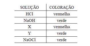 Extratos de muitas plantas são indicadores naturais ácidobase, isto é, apresentam colorações diferentes de acordo com o meio em que se encontram. Utilizando-se o extrato de repolho roxo como indicador, foram testadas soluções aquosas de HCl, NaOH, NaOCl, NaHCO3 e NH4Cl, de mesma concentração.