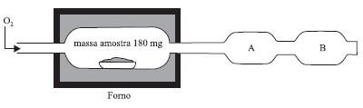 A figura apresenta um esquema de equipamento utilizado para determinação de carbono e hidrogênio em uma determinada amostra de um composto orgânico (constituído por C, H e O) com massa molar 90 g/mol. A amostra no forno sofre combustão completa com excesso de gás oxigênio. No equipamento, o interior das regiões A e B contém substâncias sólidas para reter por completo, respectivamente, a água e o gás carbônico produzidos na combustão.
