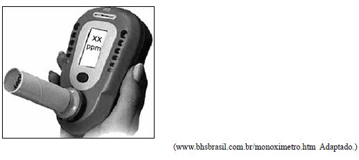 Na queima do cigarro, há a liberação dos gases CO, CO2 e de outras substâncias tóxicas como alcatrão, nicotina, fenóis e amônia (NH3). Para a conscientização sobre a toxicidade do cigarro, a campanha antifumo do estado de São Paulo mostrava o uso do monoxímetro, “bafômetro do cigarro”, que mede a concentração de monóxido de carbono, em ppm (partes por milhão), no ar exalado dos pulmões do indivíduo. A figura representa o resultado da aplicação do teste.