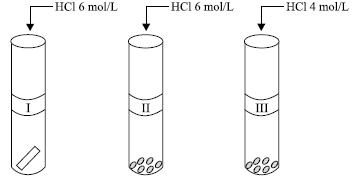 Em uma aula de laboratório de química, foram realizados três experimentos para o estudo da reação entre zinco e ácido clorídrico. Em três tubos de ensaio rotulados como I, II e III, foram colocados em cada um 5,0 x 10–3 mol (0,327 g) de zinco e 4,0 mL de solução de ácido clorídrico, nas concentrações indicadas na figura. Foi anotado o tempo de reação até ocorrer o desaparecimento completo do metal. A figura mostra o esquema dos experimentos, antes da adição do ácido no metal.