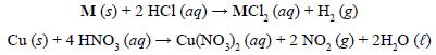Ligas metálicas são comuns no cotidiano e muito utilizadas nas indústrias automobilística, aeronáutica, eletrônica e na construção civil, entre outras. Uma liga metálica binária contendo 60% em massa de cobre foi submetida à análise para identificação de seus componentes. Uma amostra de 8,175 g da liga foi colocada em contato com excesso de solução de ácido clorídrico, produzindo 0,05 mol de gás hidrogênio. O que restou da liga foi separado e transferido para um recipiente contendo solução de ácido nítrico concentrado. As reações ocorridas são representadas nas equações, em que um dos componentes da liga é representado pela letra M.