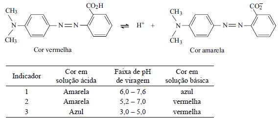 II. Uma solução aquosa incolor de NH4Cl foi posta em contato, separadamente, com cada indicador relacionado na tabela. Após o teste, a solução apresentou a coloração amarela com os indicadores 1 e 2 e vermelha com o indicador 3.