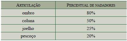 O quadro mostra o resultado de uma pesquisa realizada com 200 nadadores de competição da cidade de São Paulo, visando apontar o percentual desses nadadores que já tiveram lesões (dores) em certas articulações do corpo, decorrentes da prática de natação, nos últimos três anos.
