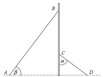 Um tubo é fixado verticalmente em uma superfície plana e, para sustentá-lo, alguns fios são presos a ele e esticados até o chão. Dois destes fios estão em lados opostos, conforme ilustra a figura a seguir. Um deles está fixado ao tubo no ponto B e o outro está fixado no ponto C.