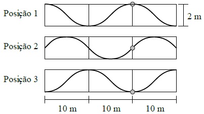 A figura mostra, em três instantes num mesmo ciclo, uma pequena boia flutuando sobre o mar, cuja onda se move para a direita com velocidade igual a 5 m/s. Os intervalos de tempo entre as posições são iguais. Analisando a figura, assinale a alternativa correta.