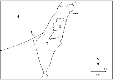 A figura abaixo apresenta a atual distribuição territorial de um espaço historicamente conflituoso no Oriente Médio. Considerando as áreas numeradas na figura, assinale a alternativa correta.
