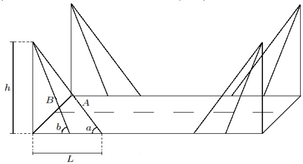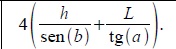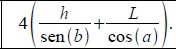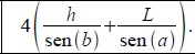 Uma construtora foi contratada para construir uma ponte. No projeto está previsto a construção, nas extremidades da ponte, de quatro colunas de concreto, de altura h , que servirão para fixar cabos de aço que sustentarão a ponte. Em cada coluna serão fixados, na extremidade superior, dois cabos de comprimentos A e B. A outra extremidade do cabo de comprimento A será fixada na ponte, a uma distância L da base da coluna, formando um ângulo a com a ponte. A outra extremidade do cabo de comprimento B também será fixada na ponte formando um ângulo b com a ponte, conforme a figura. A ponte será supostamente plana e as colunas de concreto serão construídas de modo a formar um ângulo de 90° com a ponte. É correto afirmar que a quantidade total de cabo a ser utilizado na construção da ponte é: