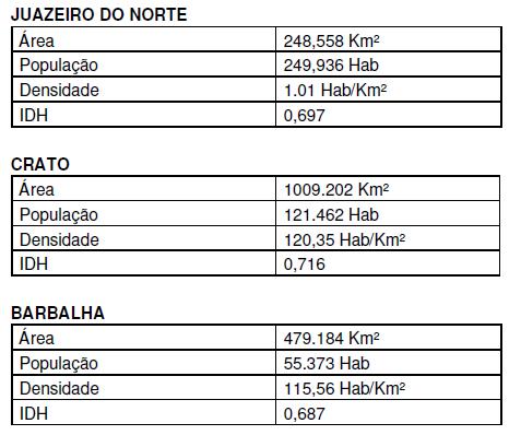 Para responder a esta questão, utilize as informações dos quadros abaixo, onde temos dados das três principais cidades da Região Metropolitana do Cariri – RMC.