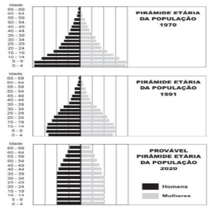 A análise de um gráfico etário permite identificar numerosas características socioeconômicas de uma população, o que pode contribuir para o direcionamento adequado das ações governamentais. Observe os gráficos etários da população brasileira em diferentes décadas.