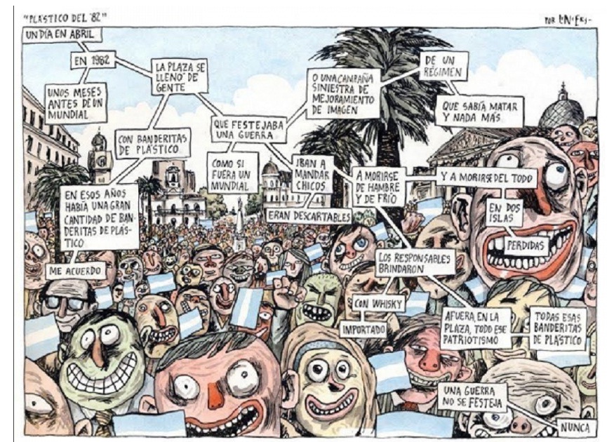A charge abaixo trata de um resumo ilustrativo do cartunista Liniers, referente a conhecida Guerra das Malvinas. Com alegação de que o arquipélago era parte integrante e indivisível de seu território e que a ocupação das ilhas por parte dos ingleses constituía-se num ato ilegal, o governo da Argentina desembarcou seus soldados no dia 2 de abril de 1982, nas ilhas, com o propósito de ocupar suas terras, provocando uma reação enérgica do governo Inglês, dando início ao conflito que durou 75 dias.
