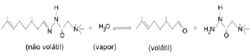 Alguns perfumes contêm substâncias muito voláteis, que evaporam rapidamente, fazendo com que o aroma dure pouco tempo. Para resolver esse problema, pode-se utilizar uma substância não volátil que, ao ser lentamente hidrolisada, irá liberando o componente volátil desejado por um tempo prolongado. Por exemplo, o composto não volátil, indicado na equação, quando exposto ao ar úmido, produz o aldeído volátil citronelal: