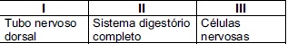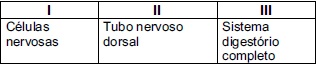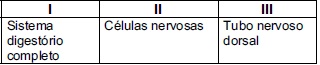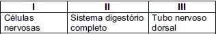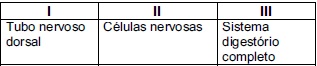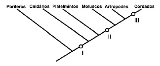O esquema abaixo representa uma árvore filogenética de alguns filos animais. Cada número, I, II e III, corresponde à aquisição de uma característica ausente nos ramos anteriores a ele e presente nos posteriores.