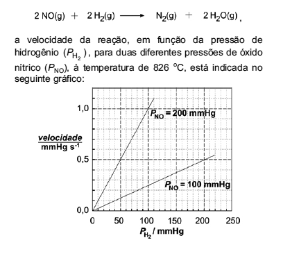 Examinando o gráfico, pode-se concluir que as ordens da reação, em relação ao óxido nítrico e em relação ao hidrogênio, são, respectivamente,