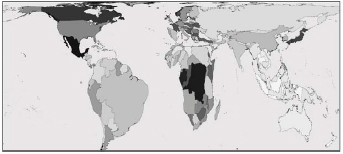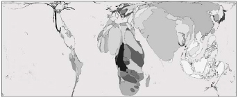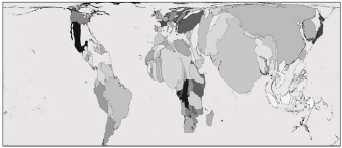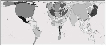 Nota — Considere apenas os tamanhos e as deformações dos países, que são proporcionais à informação representada. (Fontes: www.worldmapper.org. Acessado em 17/08/2009. Le Monde Diplomatique, 2009.)