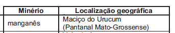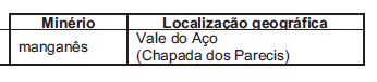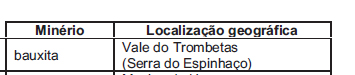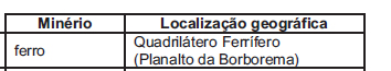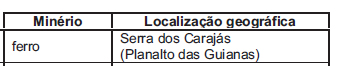 Em se tratando de commodities, o Brasil tem papel relevante no mercado mundial, graças à exportação de minérios. Destacam-se os minérios de ferro e de manganês, bases para a produção de aço, e a bauxita, da qual deriva o alumínio. A relação entre minério e sua localização no território brasileiro está corretamente expressa em: