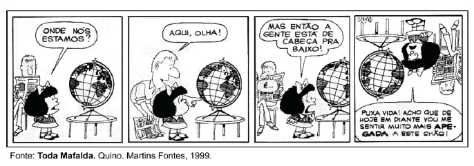 A personagem Mafalda, que está em Buenos Aires, olha o globo em que o Norte está para cima e afirma: "a gente está de cabeça pra baixo". Quem olha para o céu noturno dessa posição geográfica não vê a estrela Polar, referência do polo astronômico Norte, e sim o Cruzeiro do Sul, referência do polo astronômico Sul. Se os polos do globo de Mafalda estivessem posicionados de acordo com os polos astronômicos, ou seja, o polo geográfico Sul apontando para o polo astronômico Sul, seria correto afirmar que