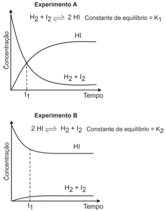 A uma determinada temperatura, as substâncias HI, H2 e I2 estão no estado gasoso. A essa temperatura, o equilíbrio entre as três substâncias foi estudado, em recipientes fechados, partindo-se de uma mistura equimolar de H2 e I2 (experimento A) ou somente de HI (experimento B).